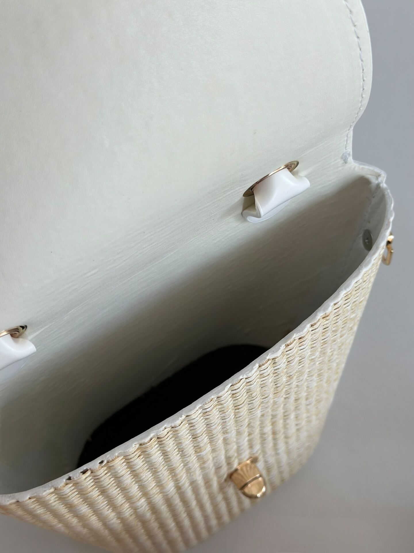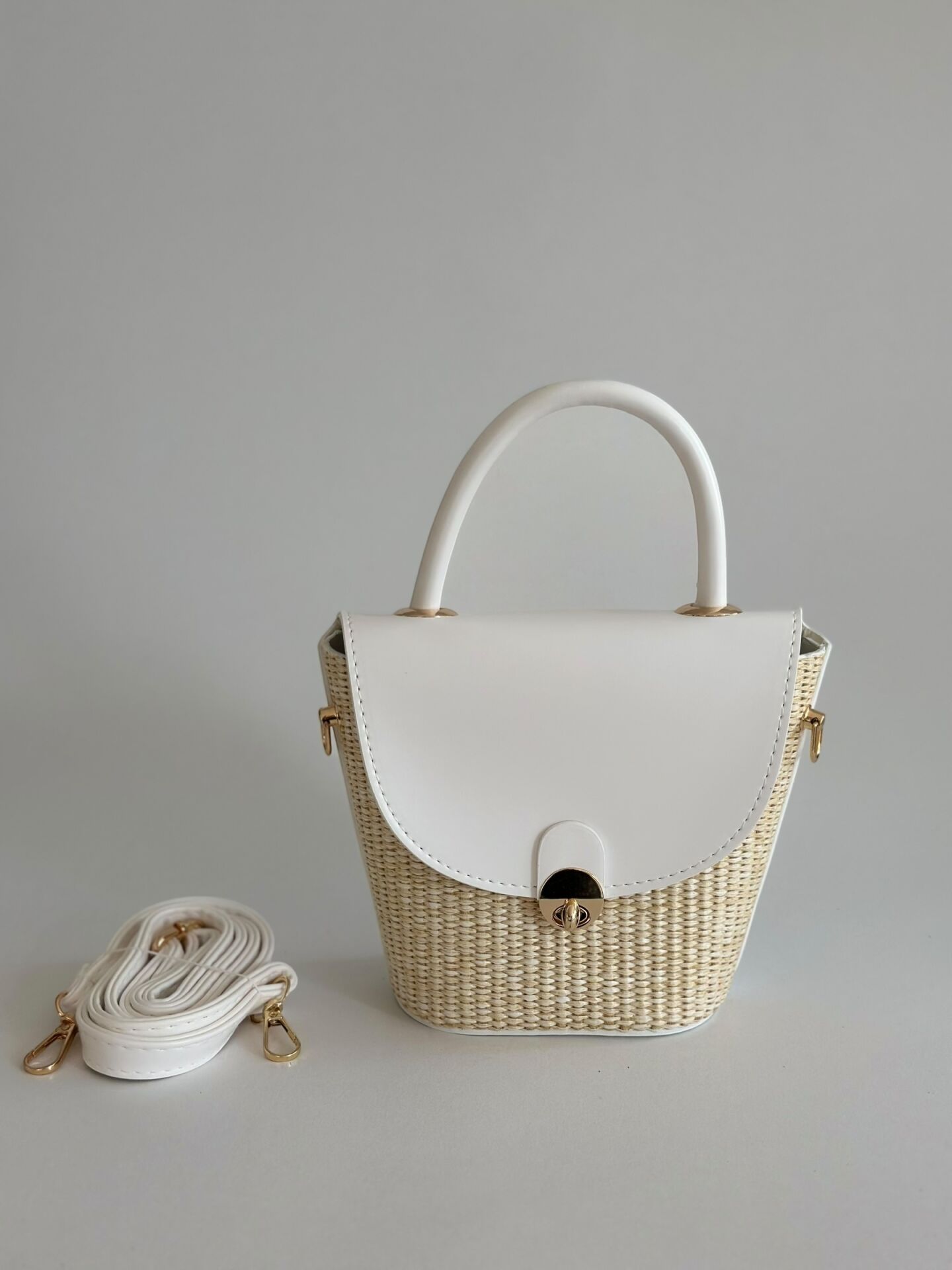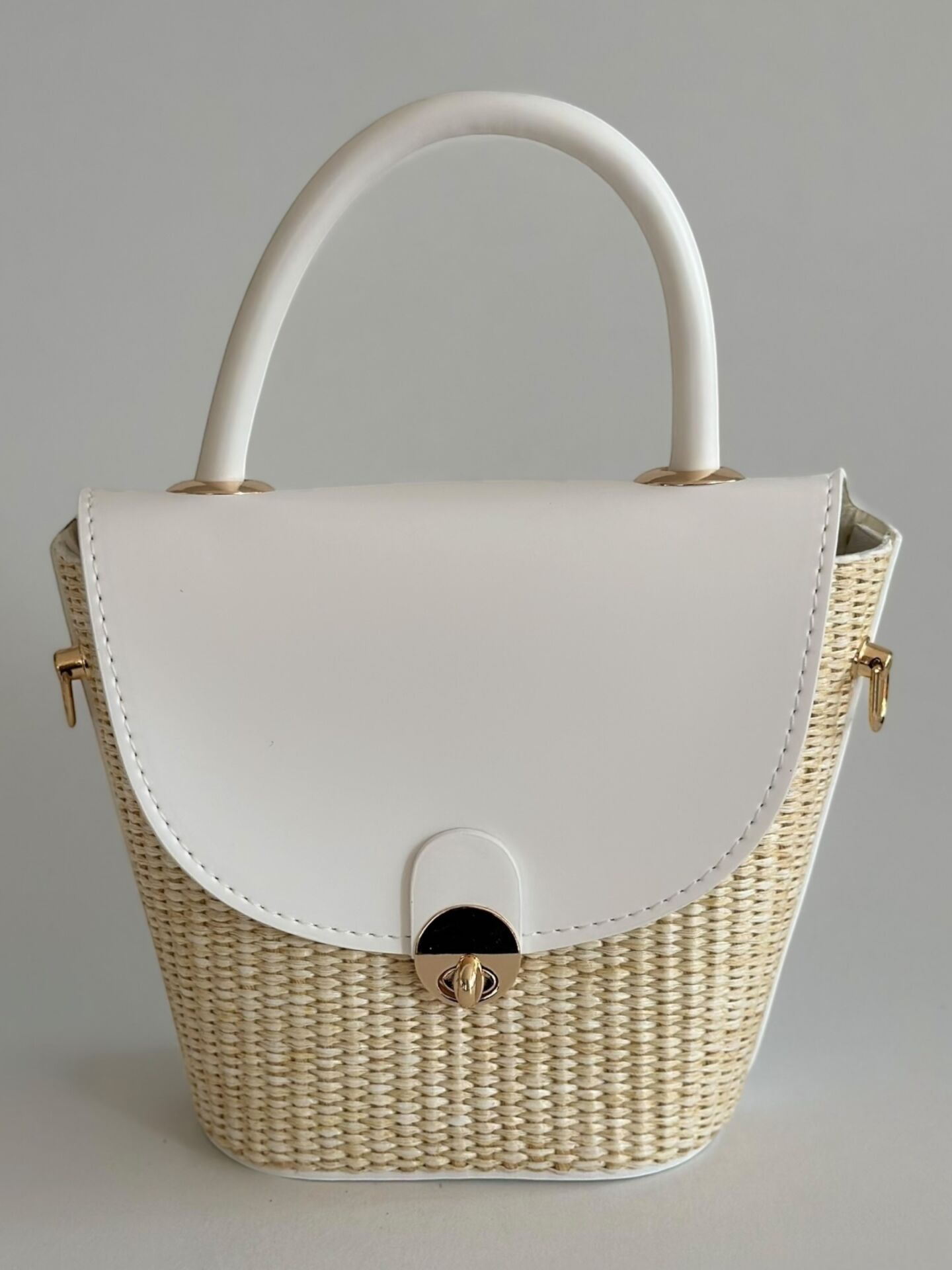 Hasır dokunun doğallığı ile suni derinin şıklığını bir araya getiren bu bucket form çanta, günün her anında stiline eşlik edecek.