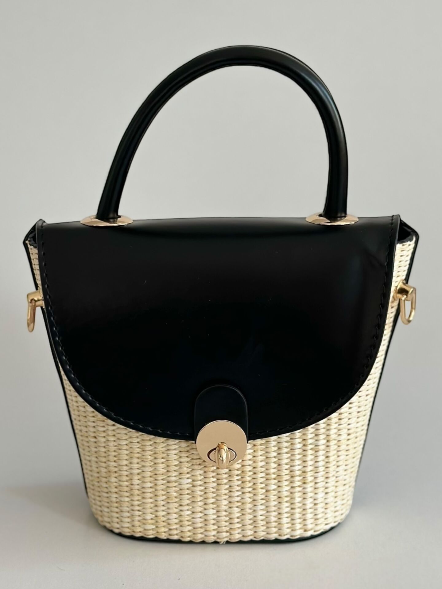 Hasır dokunun doğallığı ile suni derinin şıklığını bir araya getiren bu bucket form çanta, günün her anında stiline eşlik edecek.