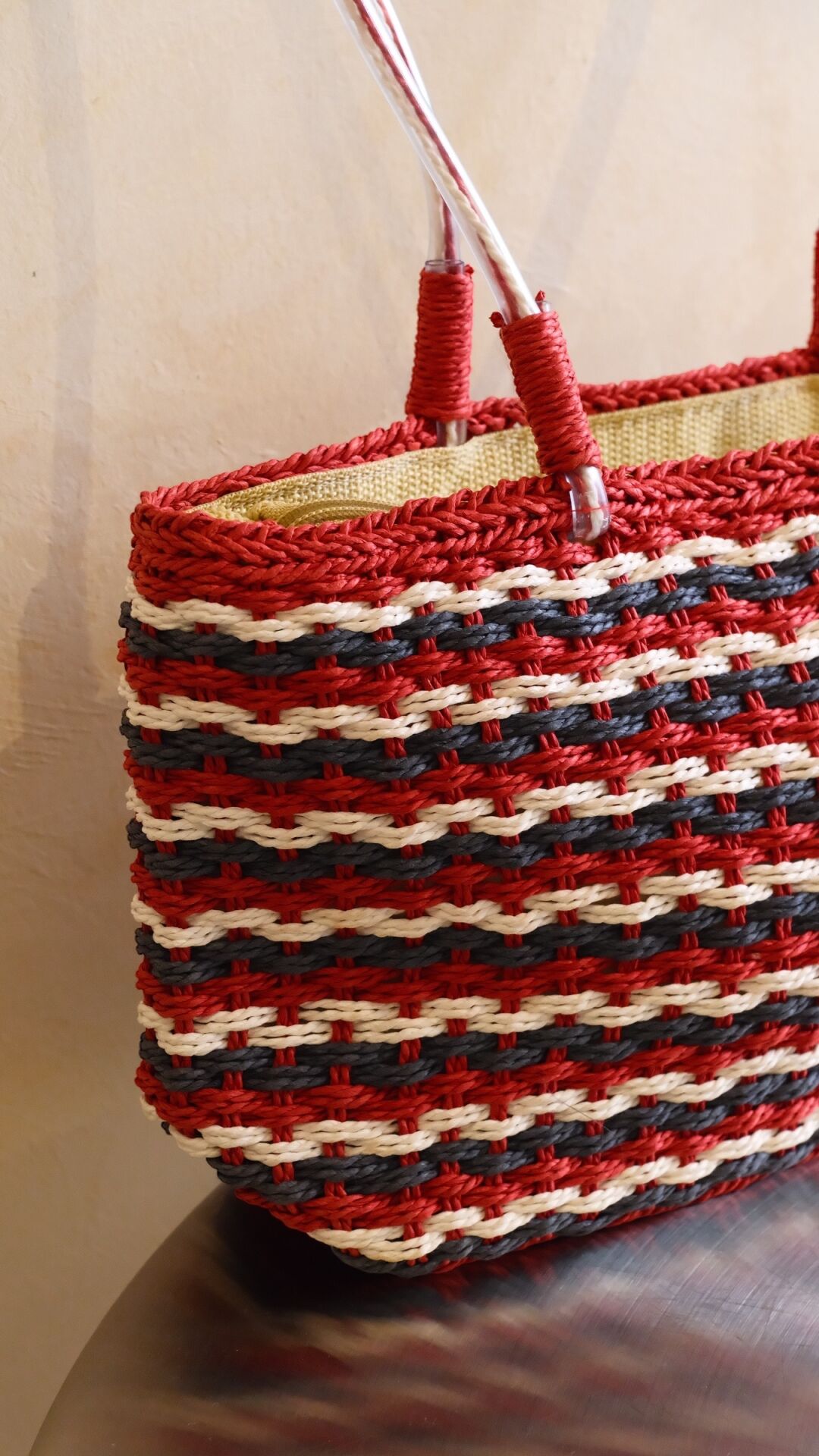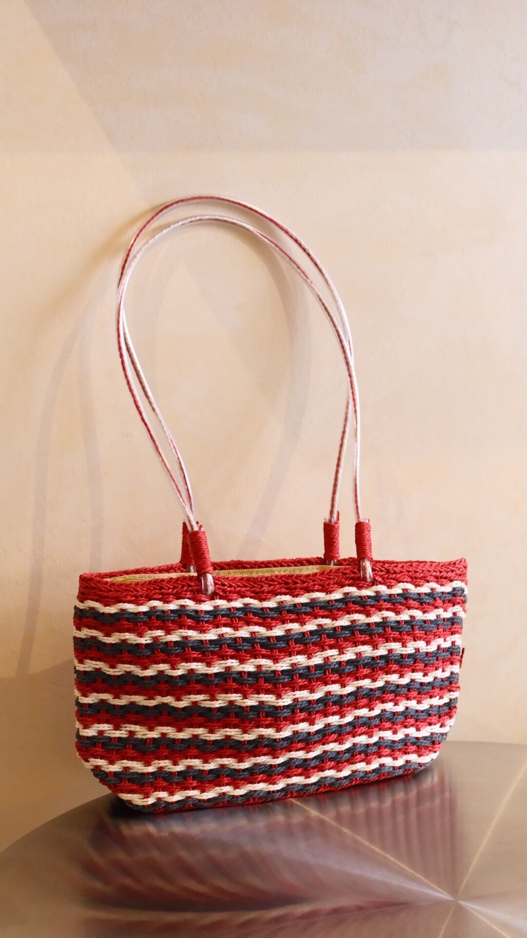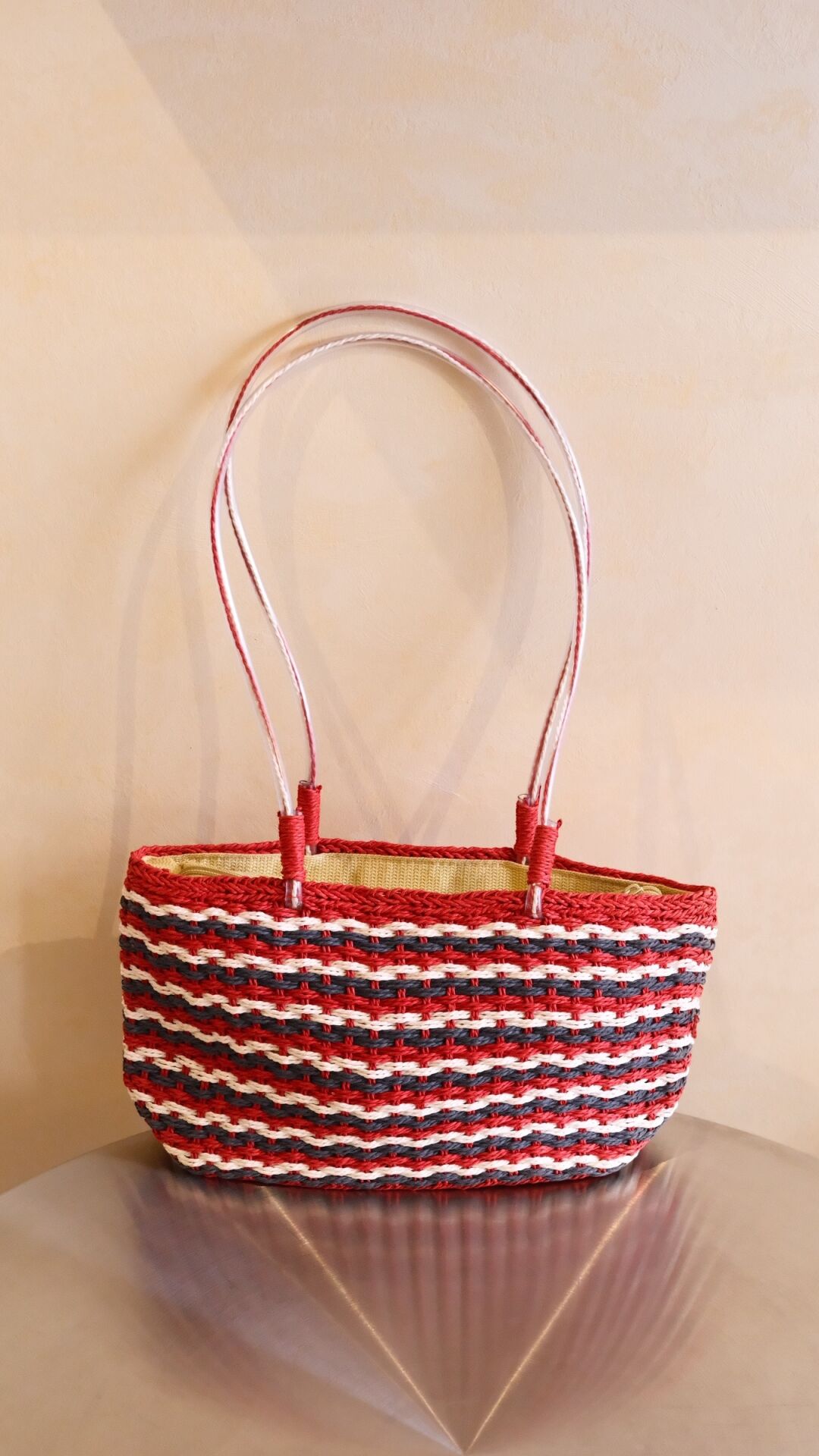 Kırmızı, lacivert ve krem çizgileriyle retro bir hava katan Çizgili Hasır Çanta; elde örme dokusu ve hafif yapısıyla yaz kombinlerine canlılık katıyor. Uzun sapları sayesinde omuzda rahat taşınır, geniş iç hacmiyle gün boyu ihtiyacın olan her şeyi yanında taşımanı sağlar.