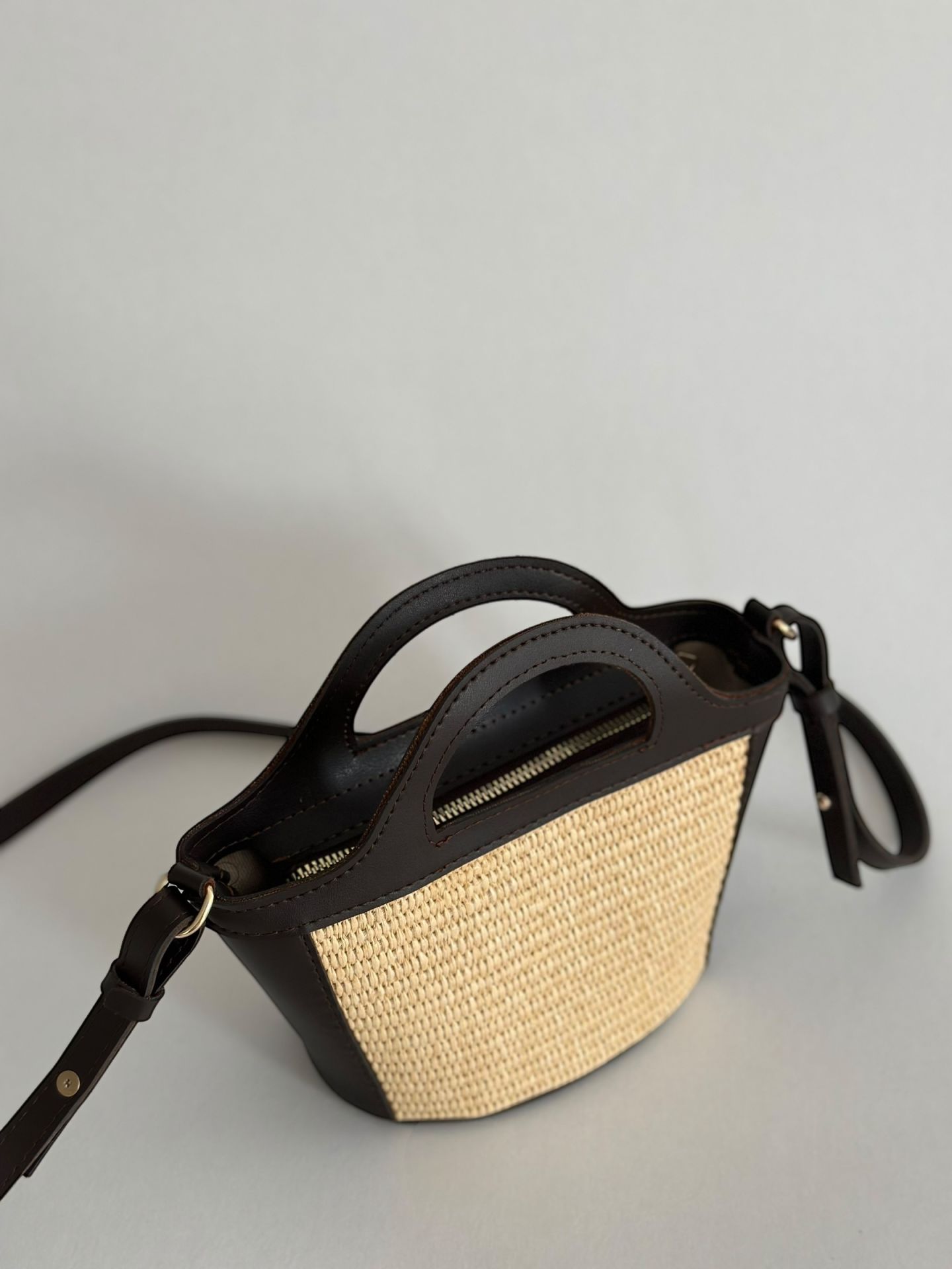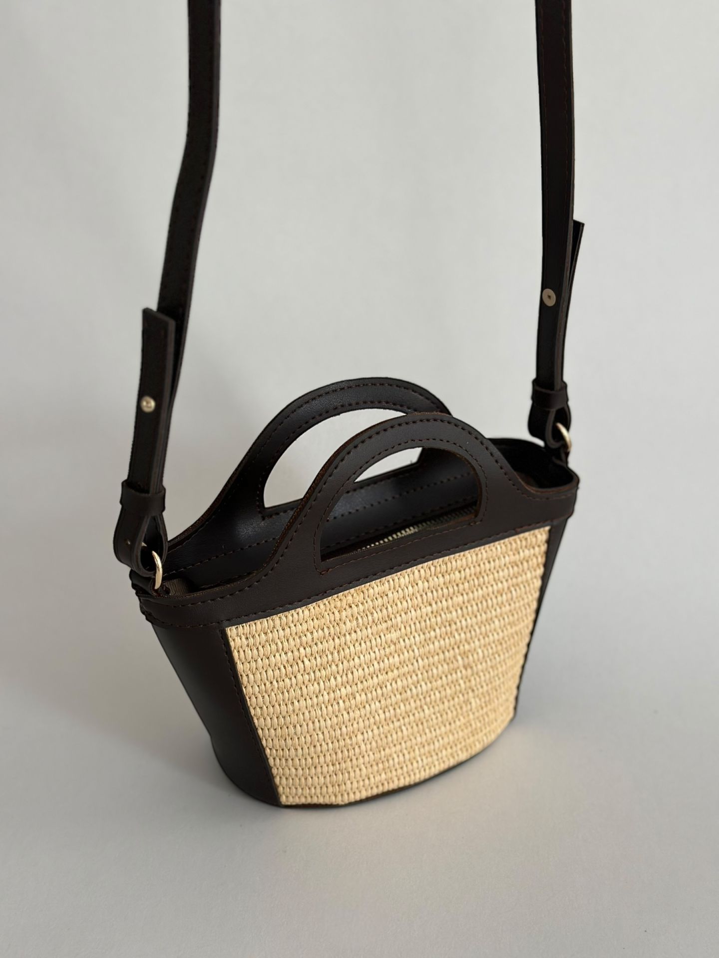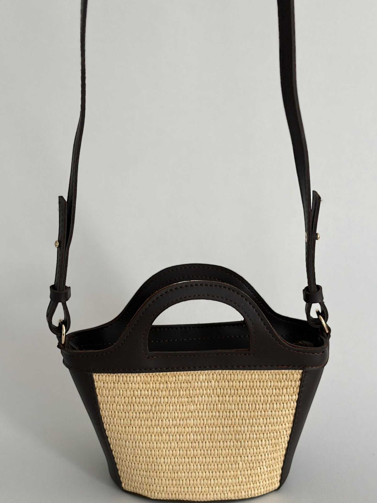 Hasır dokusu detaylarıyla öne çıkan bu mini çanta, hem el çantası hem de omuz çantası olarak kullanılabilir.