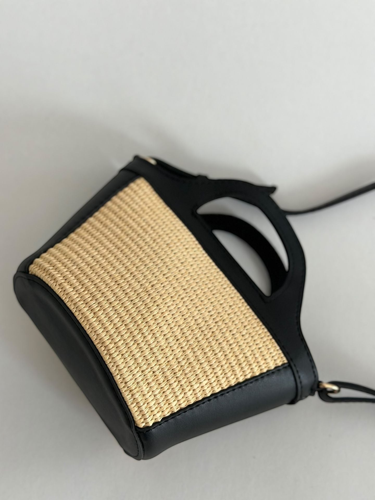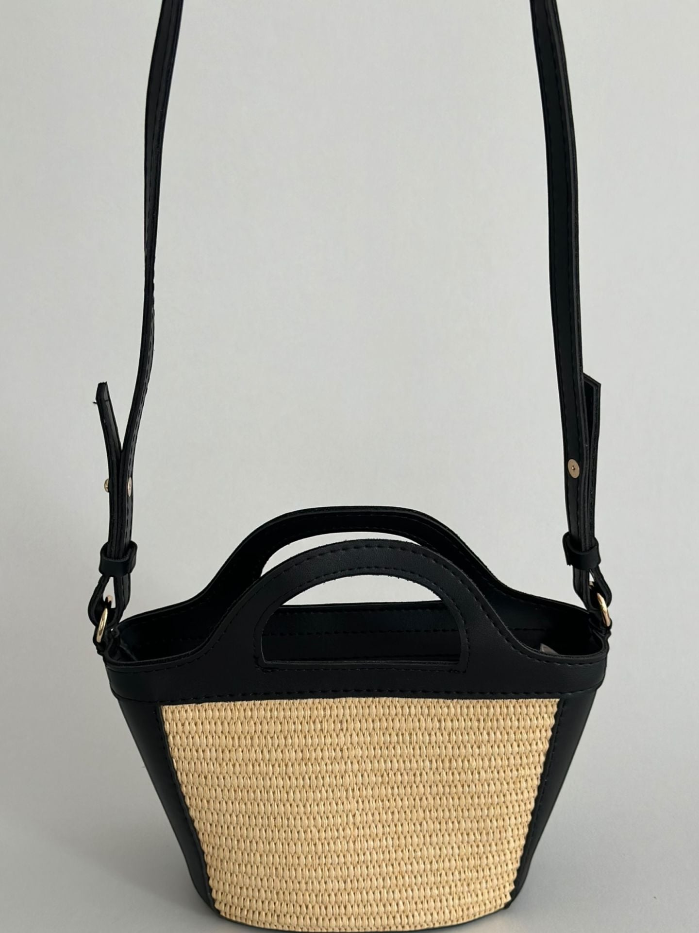 Hasır dokusu detaylarıyla öne çıkan bu mini çanta, hem el çantası hem de omuz çantası olarak kullanılabilir.