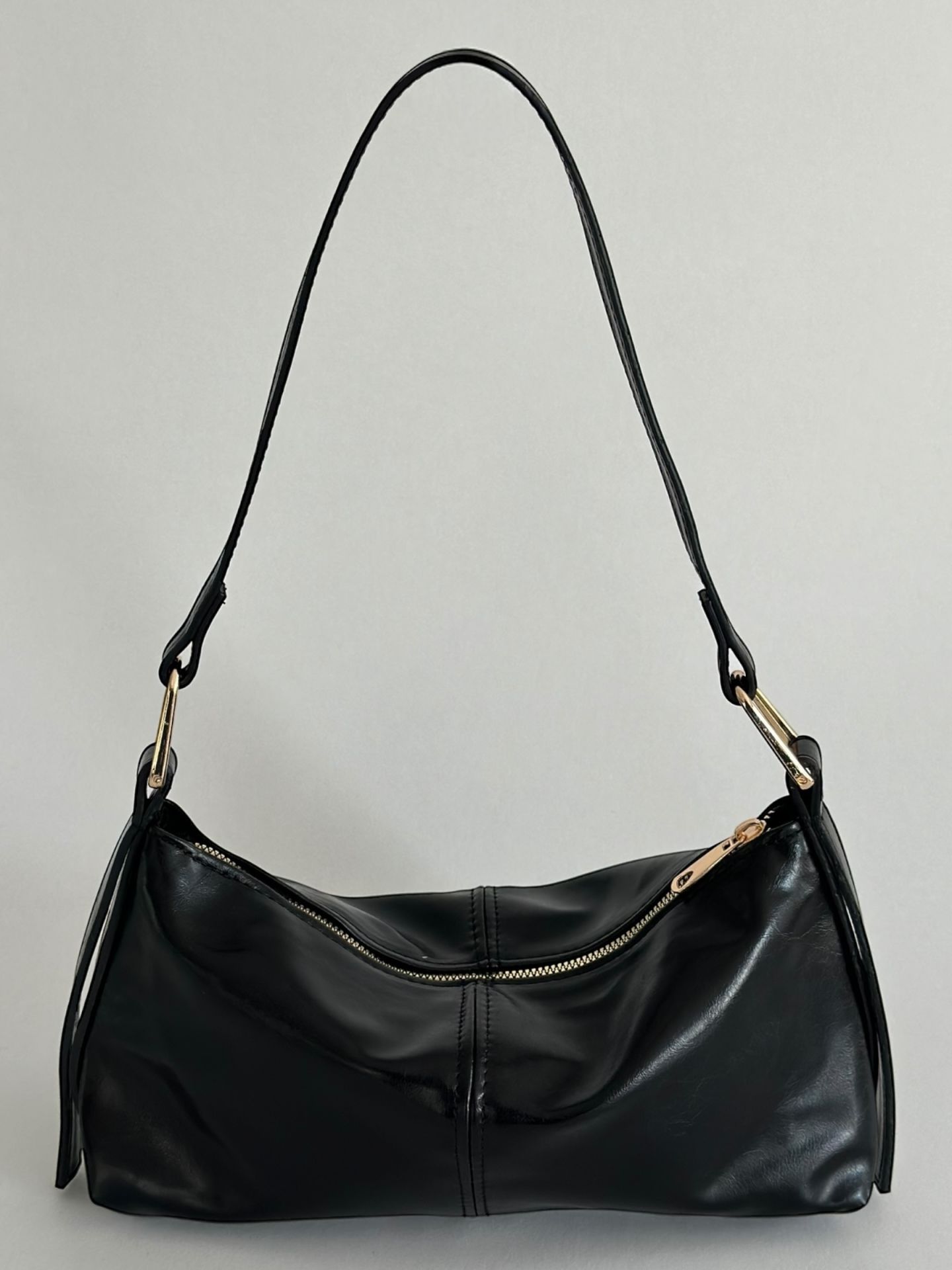 Zarif duruşu ve yumuşak formuyla öne çıkan bu omuz çantası, günlük stilinize sofistike bir dokunuş katmak için tasarlandı. 27 cm genişliği ve 15 cm yüksekliğiyle minimal ama kullanışlı bir alan sunar. İç kısmındaki fermuarlı mini gözü sayesinde küçük eşyalarınızı güvenle saklayabilirsiniz.