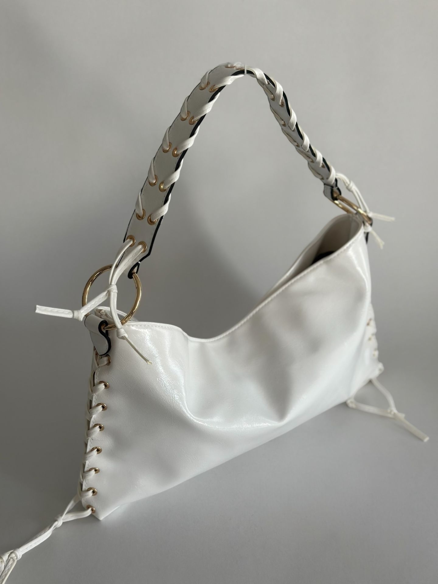 Yanlarındaki bağcık detayları ve altın renk metal halkalar , çantaya şık ve dikkat çekici bir hava katar.