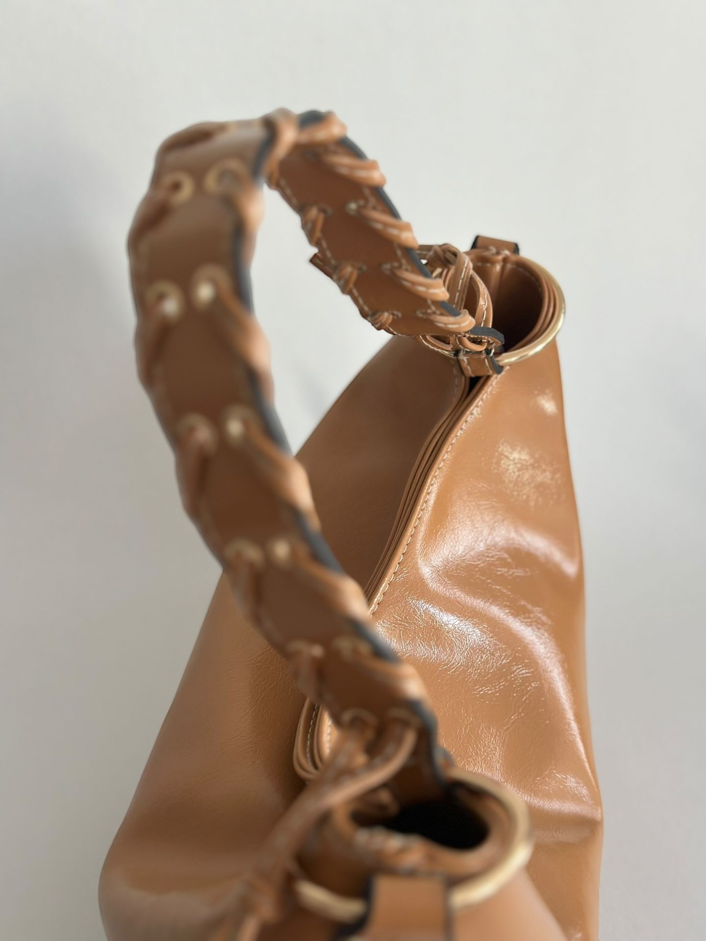 Yanlarındaki bağcık detayları ve altın renk metal halkalar , çantaya şık ve dikkat çekici bir hava katar.