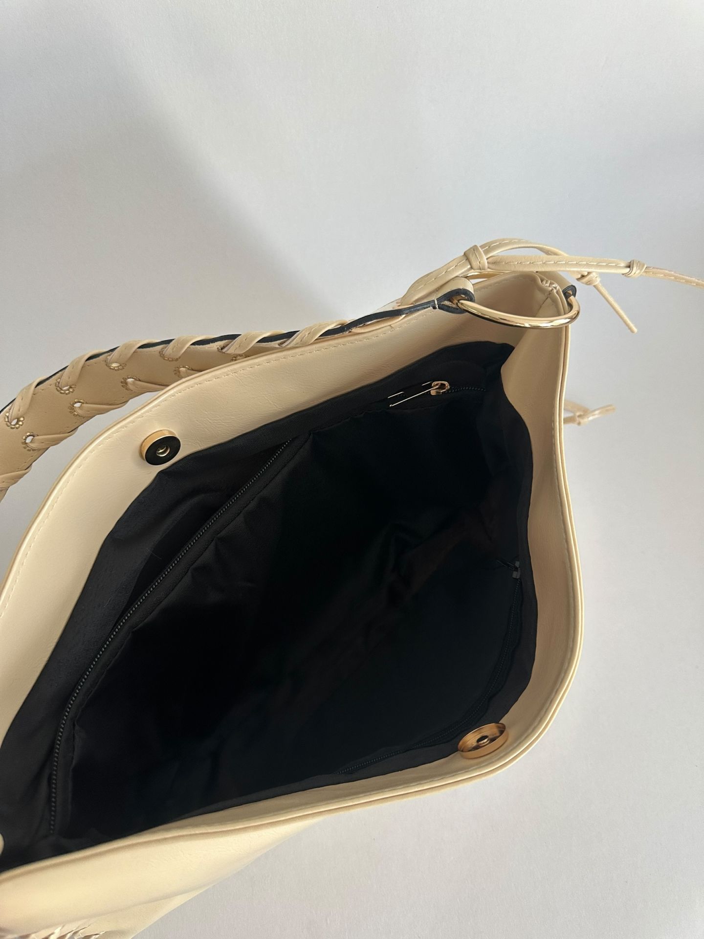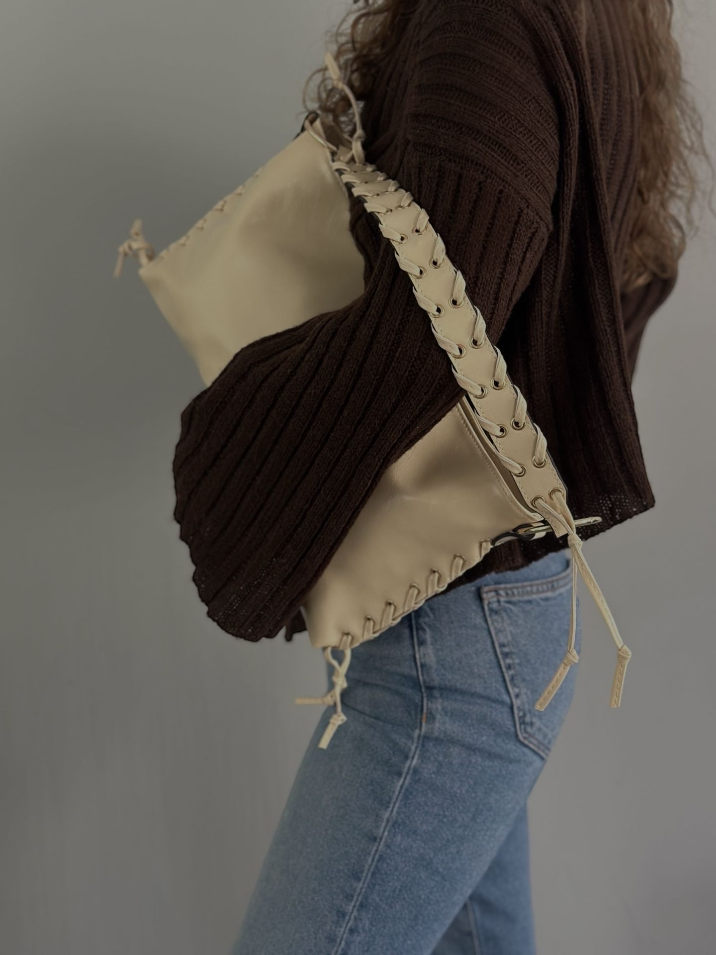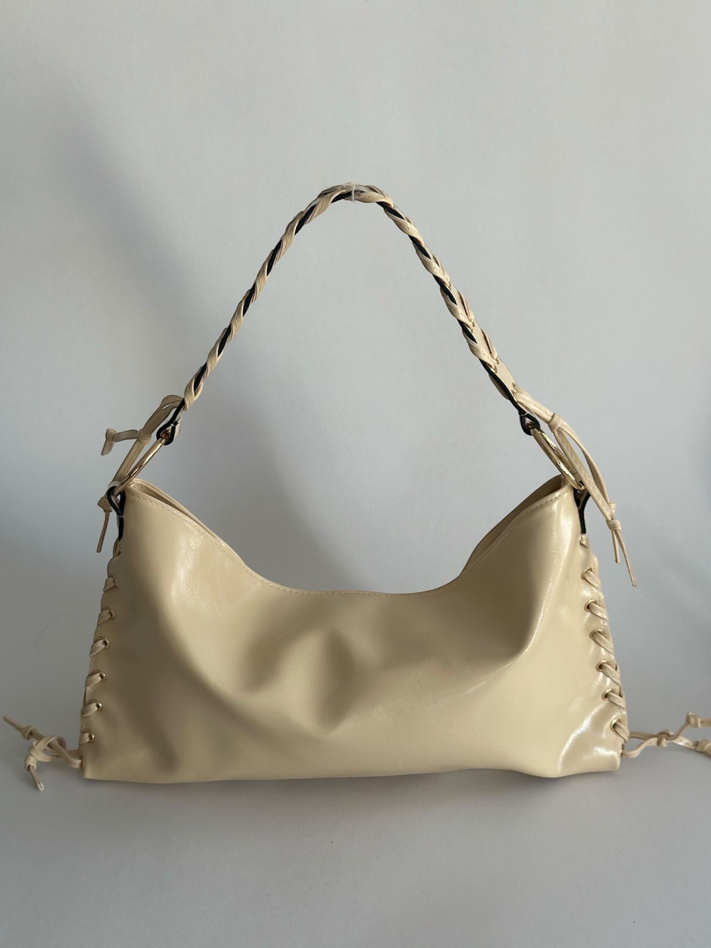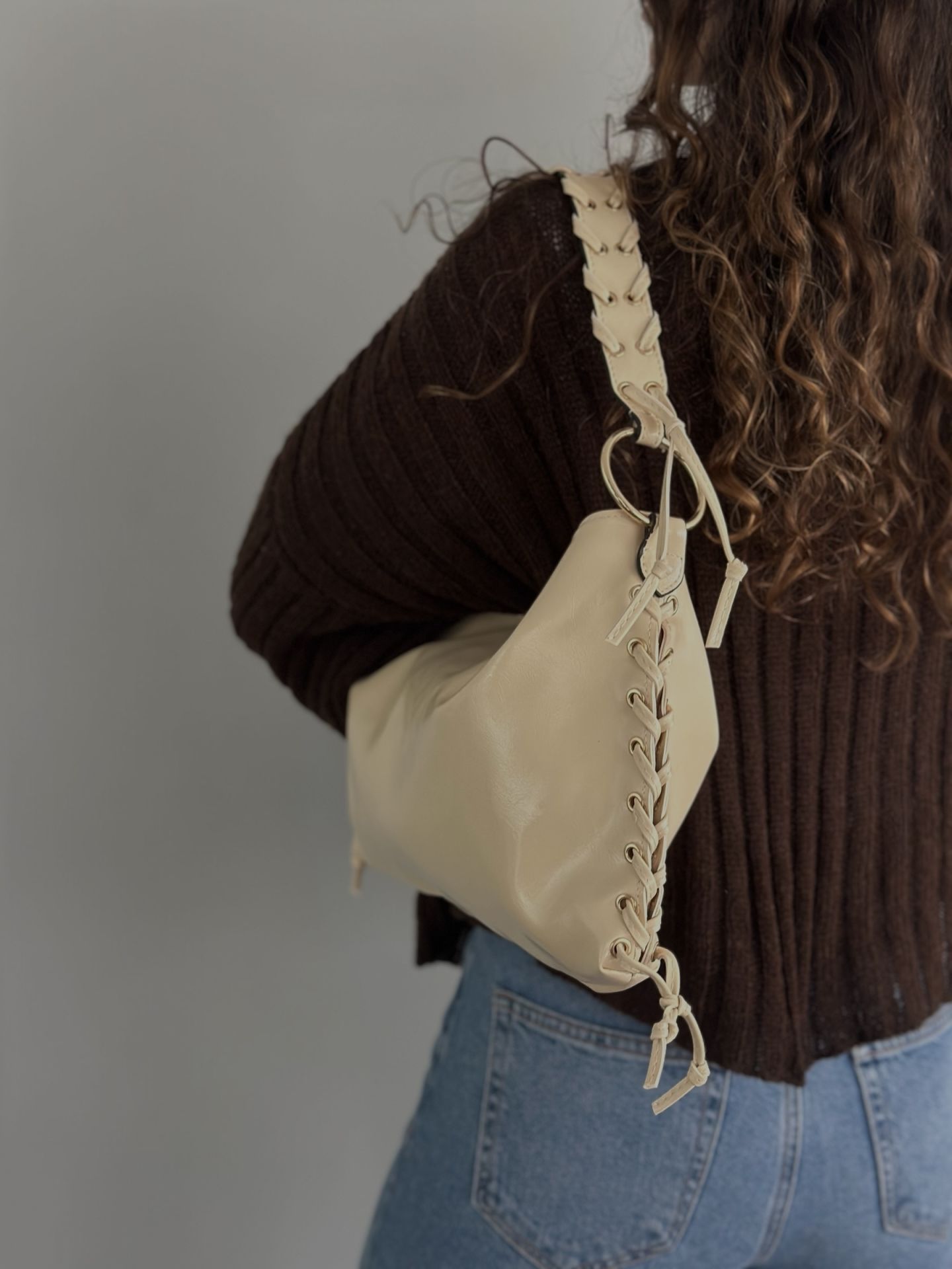 ✅ Yanlarındaki bağcık detayları ve altın renk metal halkalar , çantaya şık ve dikkat çekici bir hava katar.