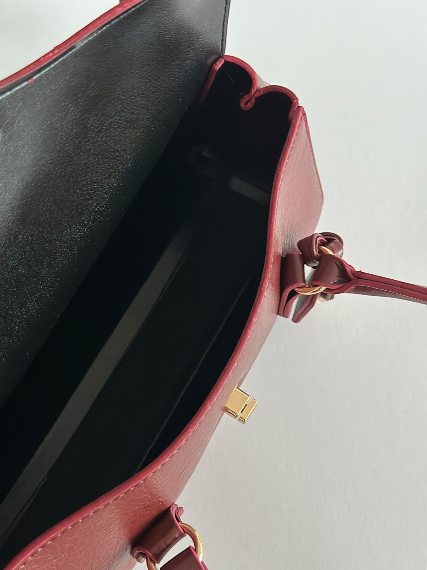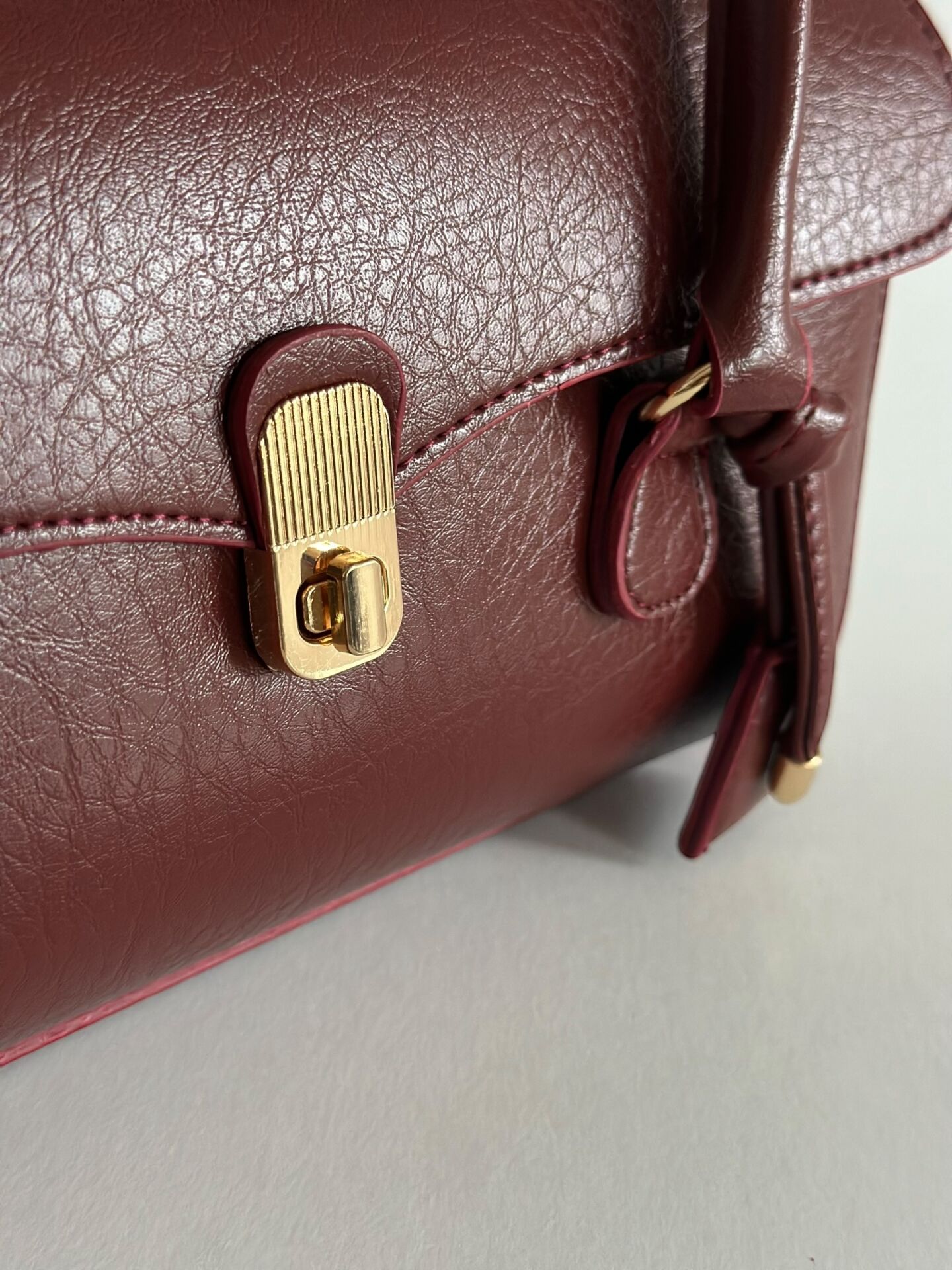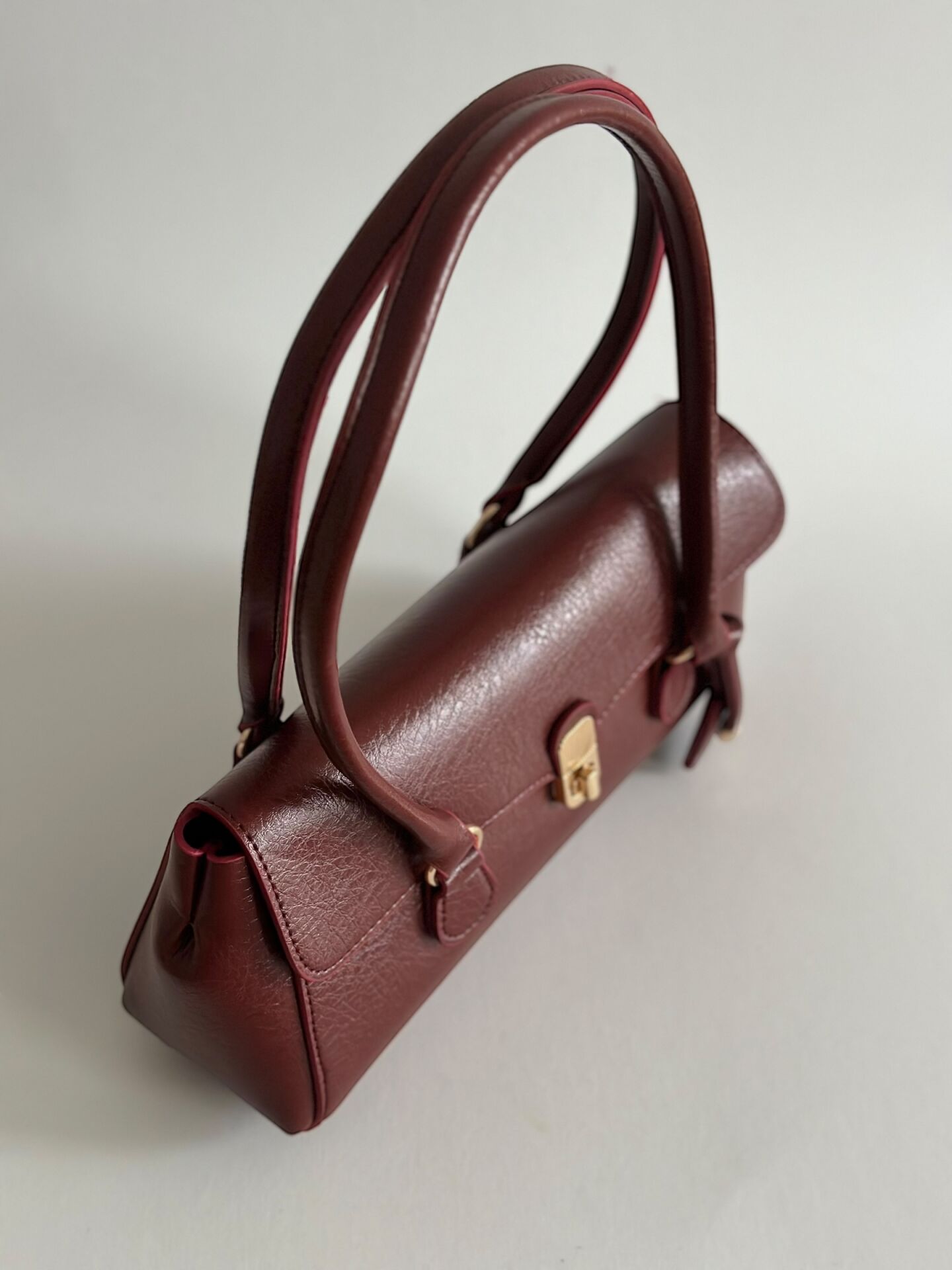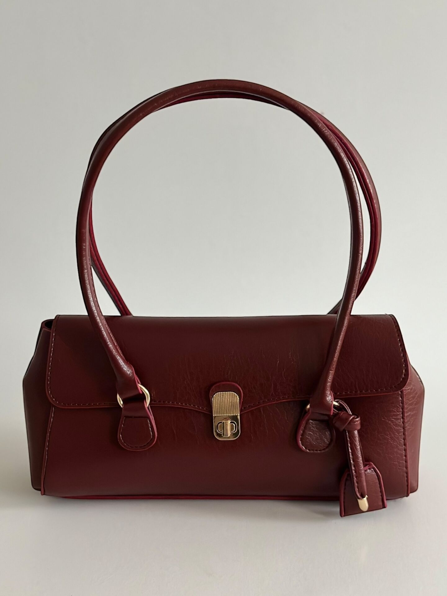 Minimal formu, gold kilit detayı ve tok duruşu ile sofistike bir görünüm sunar.