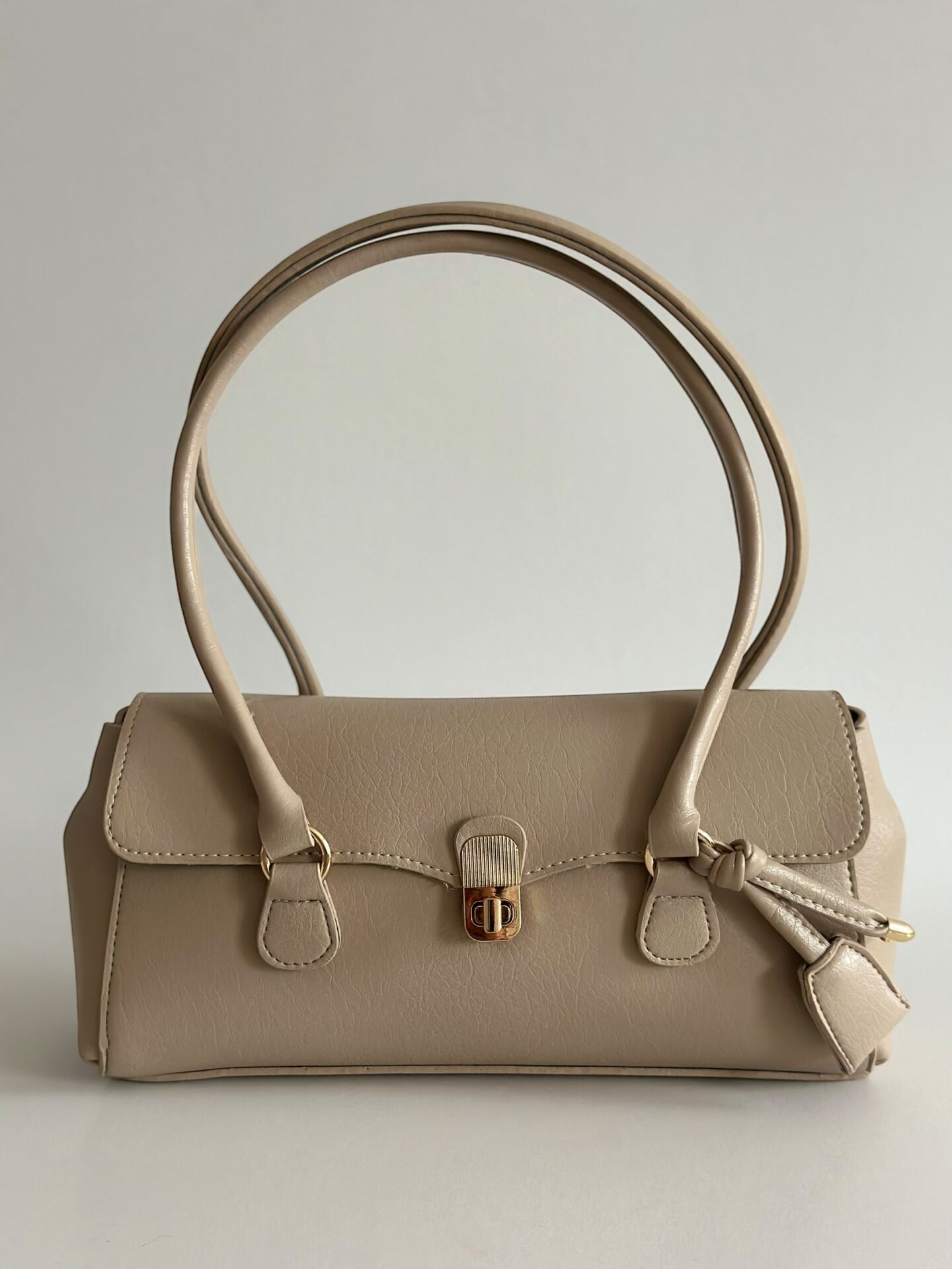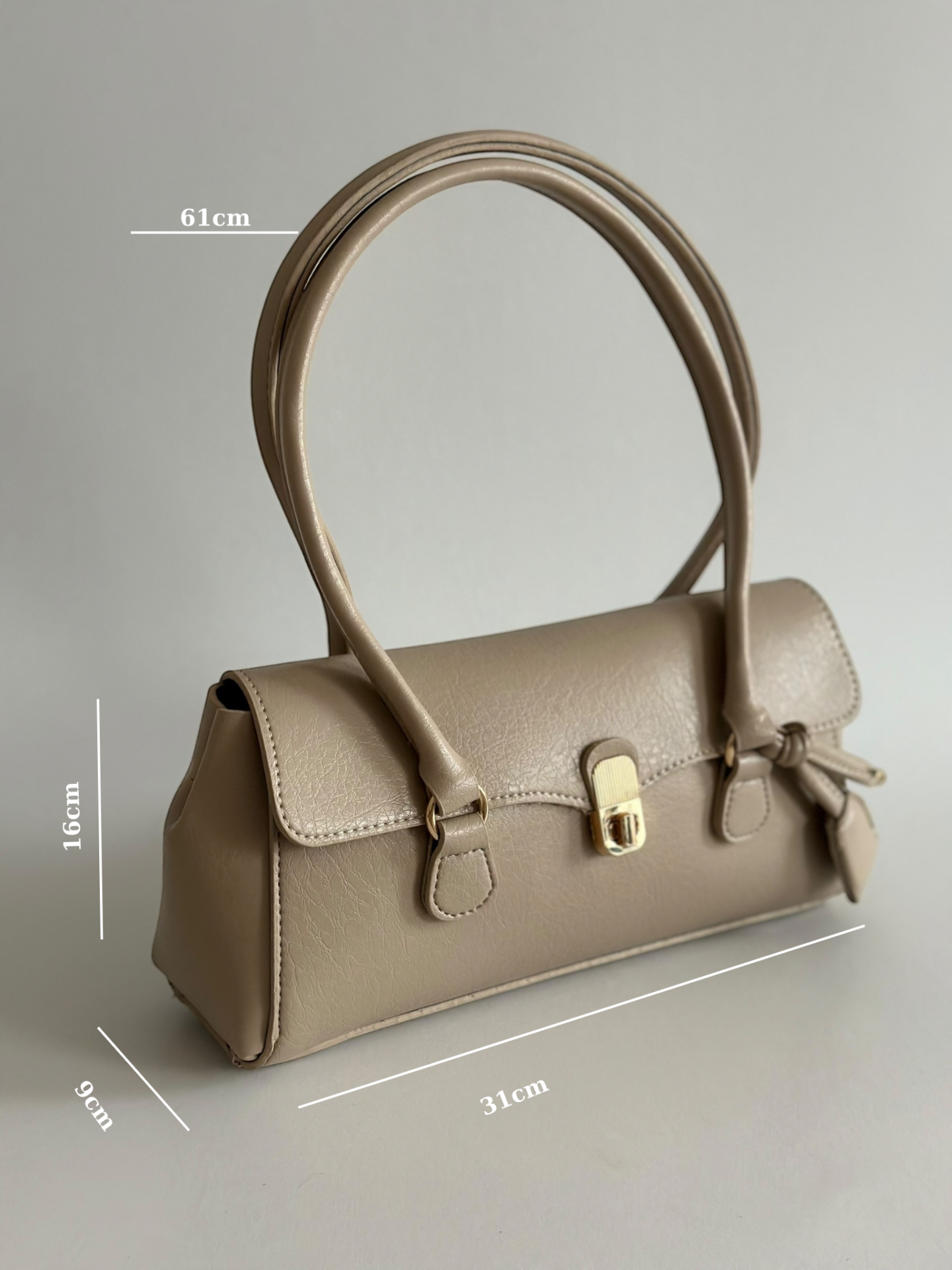 Minimal formu, gold kilit detayı ve tok duruşu ile sofistike bir görünüm sunar.