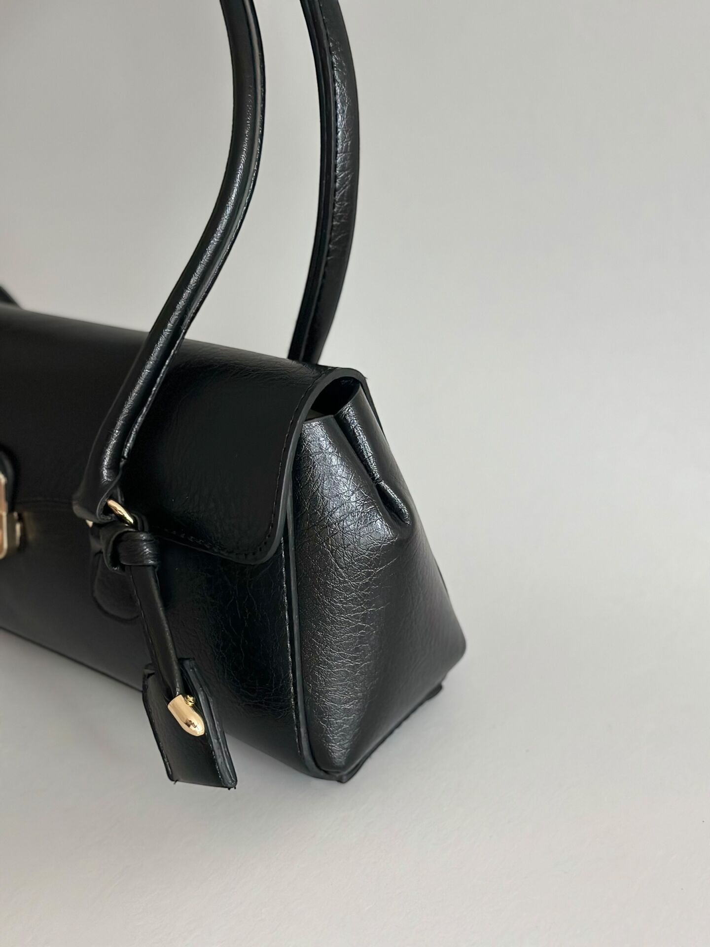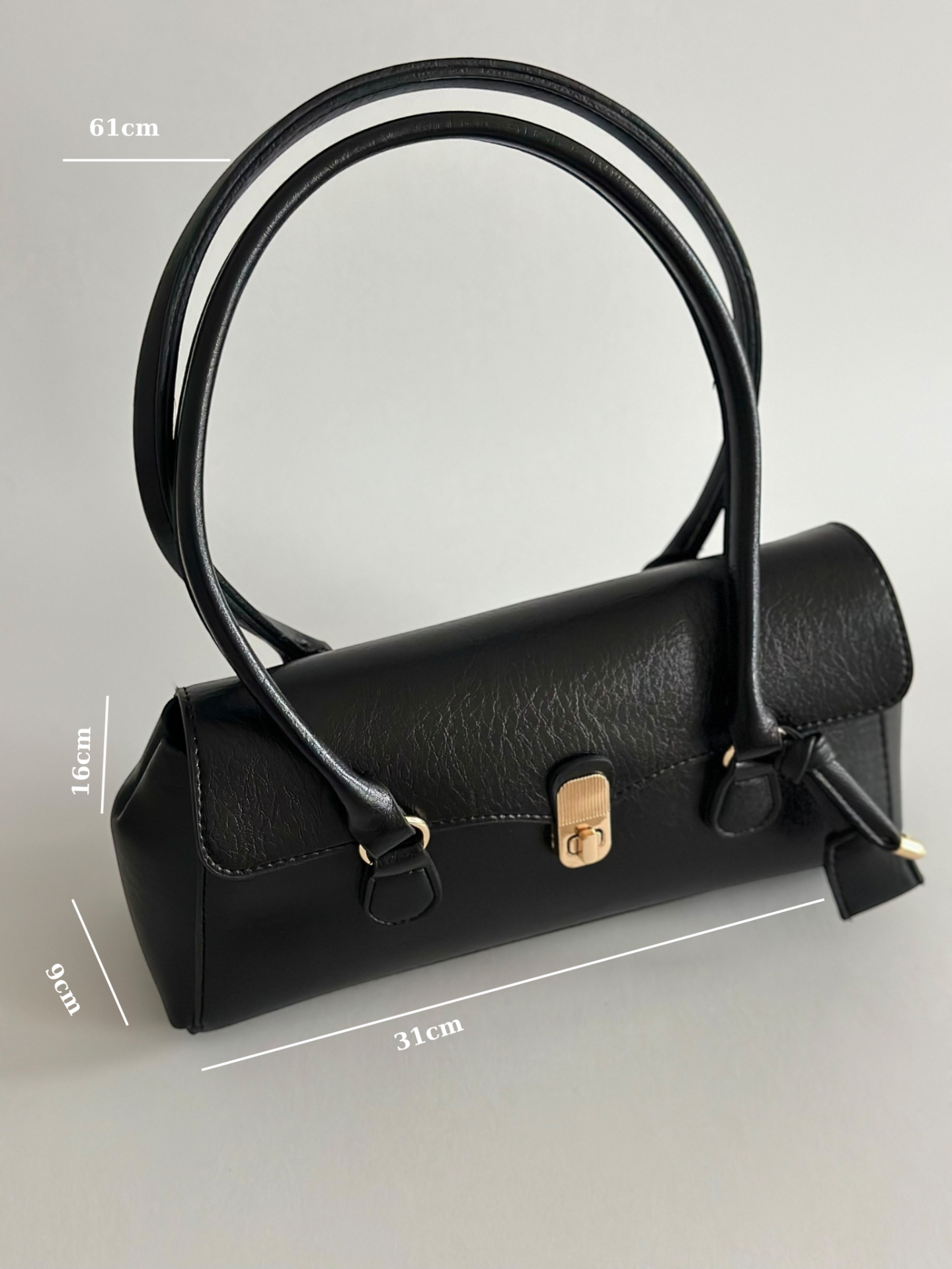 Minimal formu, gold kilit detayı ve tok duruşu ile sofistike bir görünüm sunar.