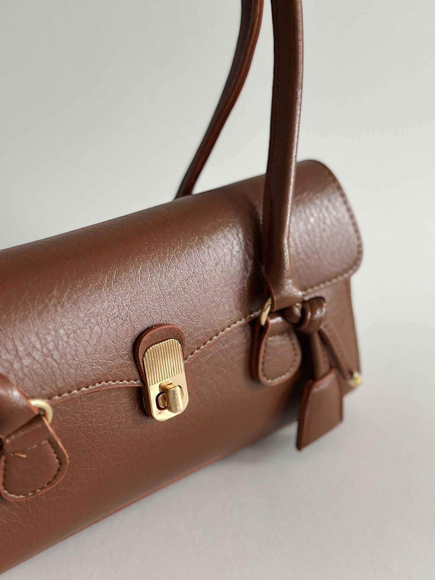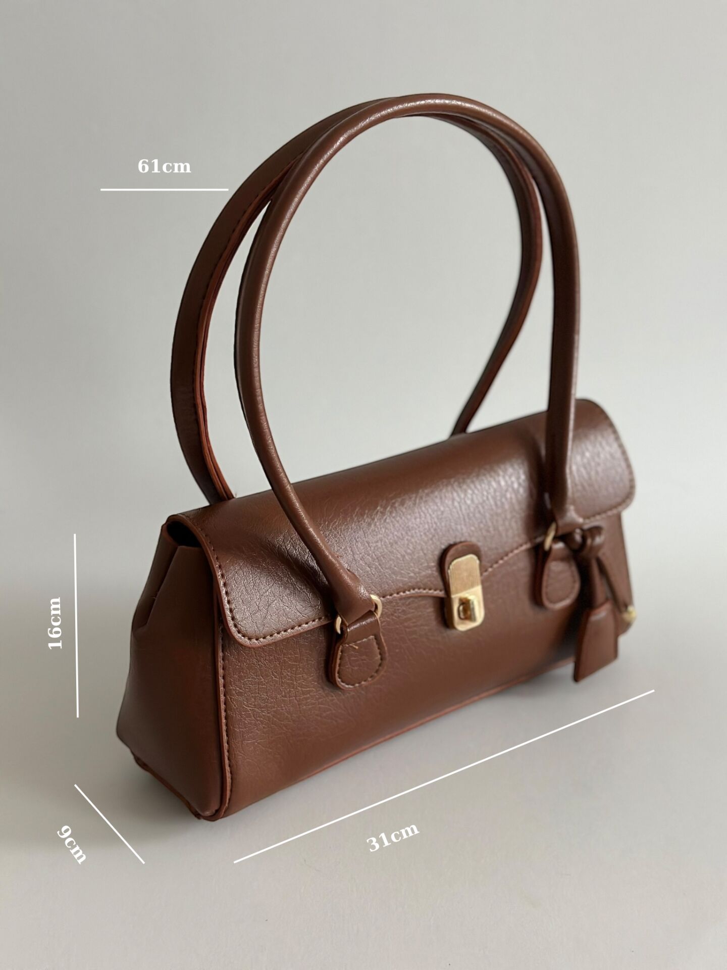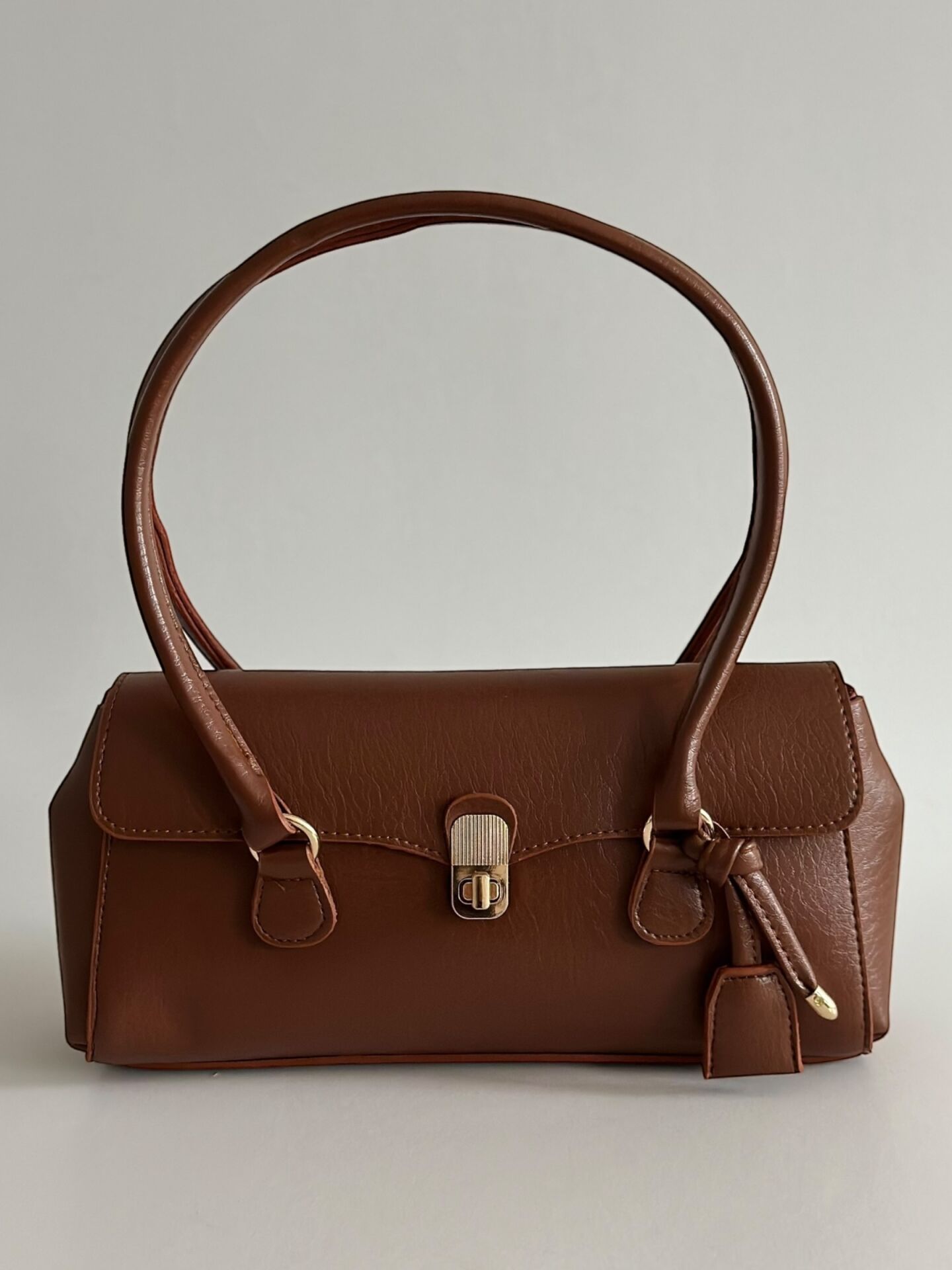 Minimal formu, gold kilit detayı ve tok duruşu ile sofistike bir görünüm sunar.