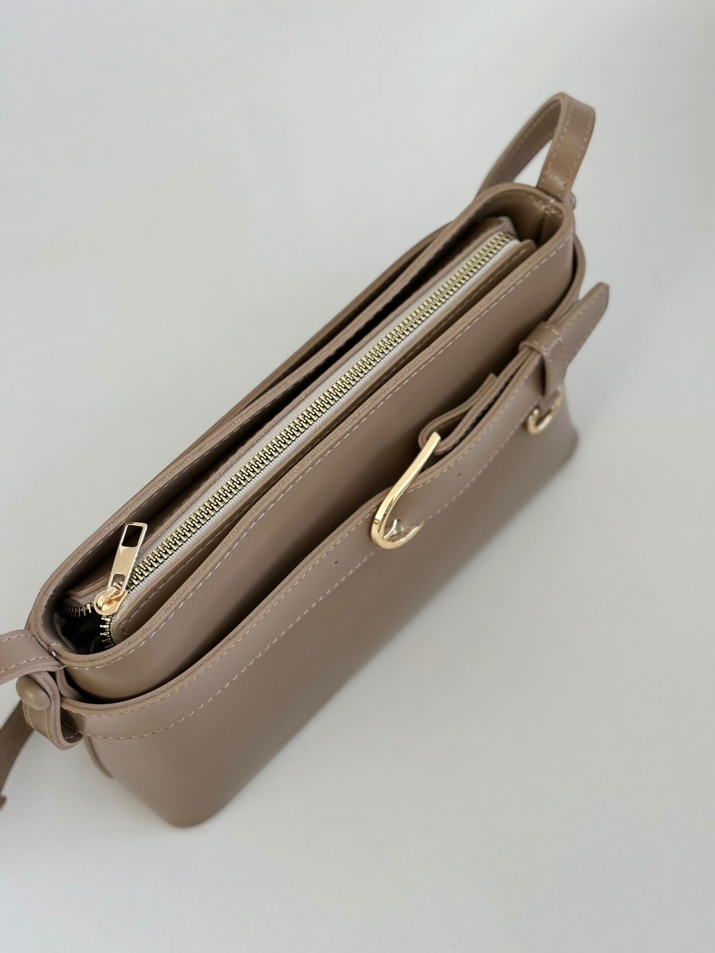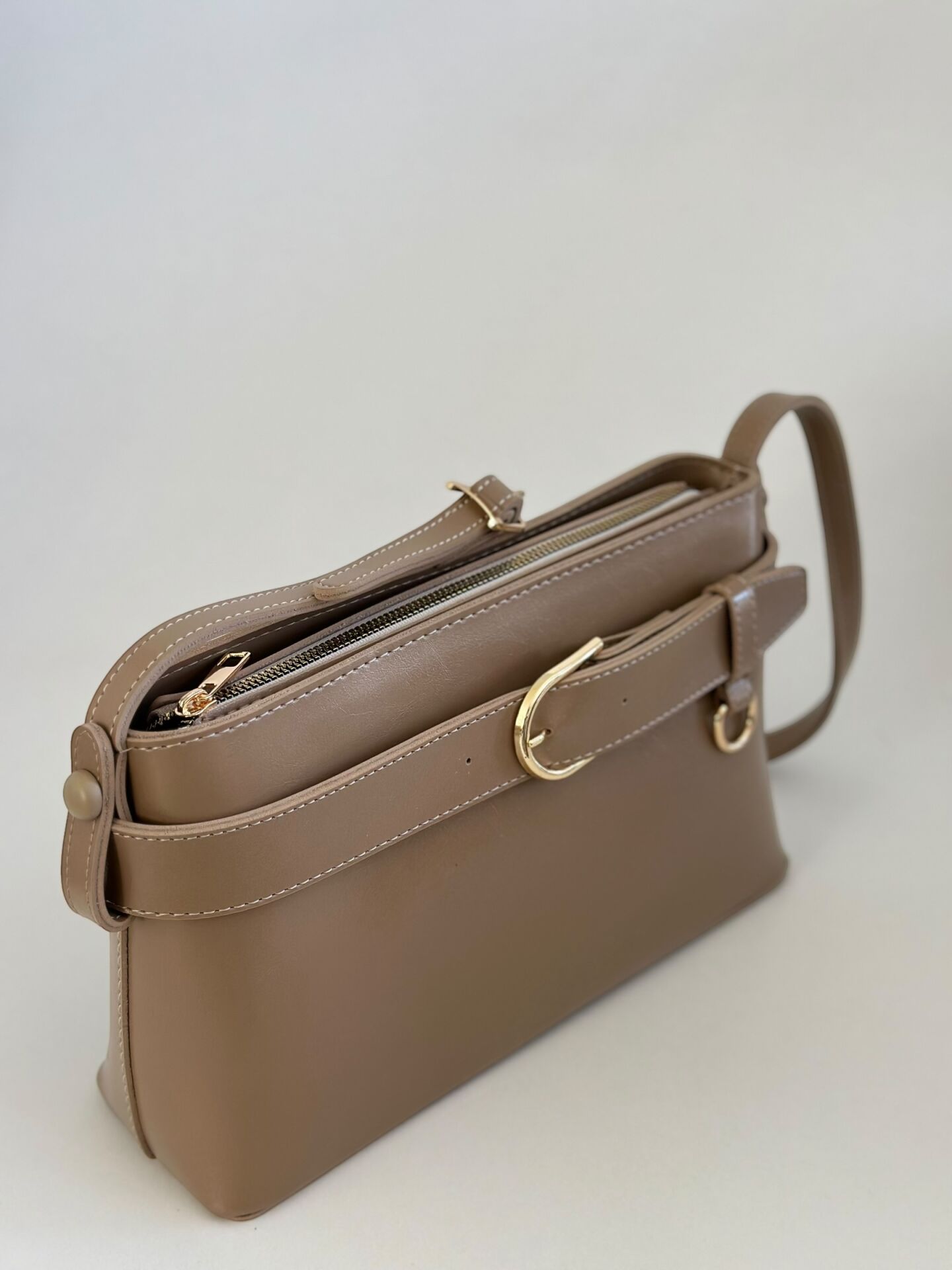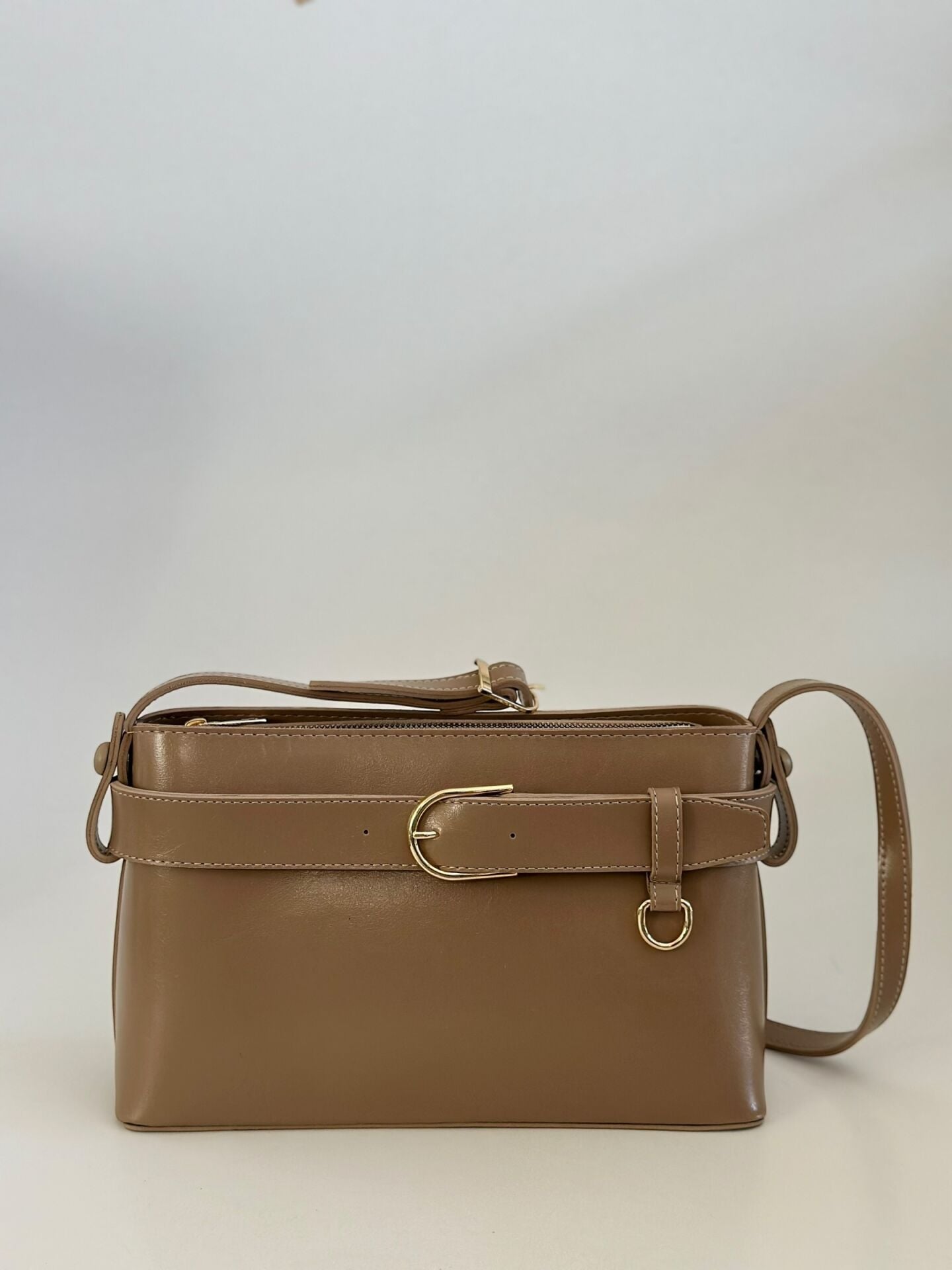 Ön yüzeyde yer alan şık kemer detayı ve gold aksesuarları, çantaya güçlü ve sofistike bir görünüm kazandırır. Günlük kullanım için ideal olan yapısı sayesinde telefon, cüzdan, anahtar ve diğer temel eşyalarınızı rahatlıkla taşıyabilirsiniz.