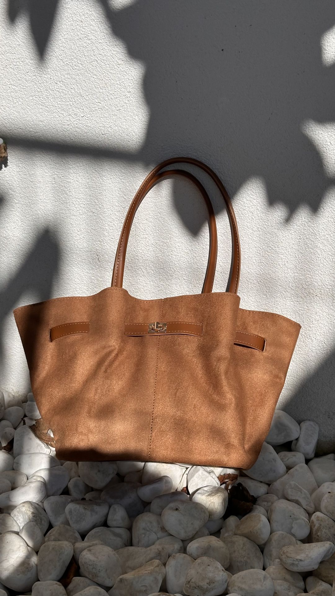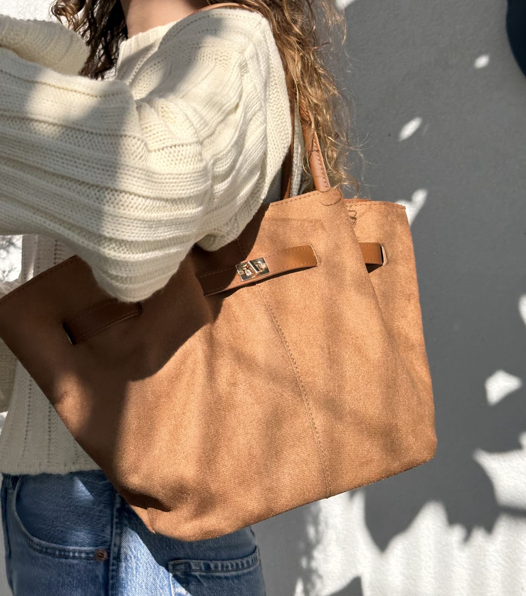 Göz alıcı süet dokusuyla bu çanta, her stile uyum sağlayan zarif bir tasarıma sahip.