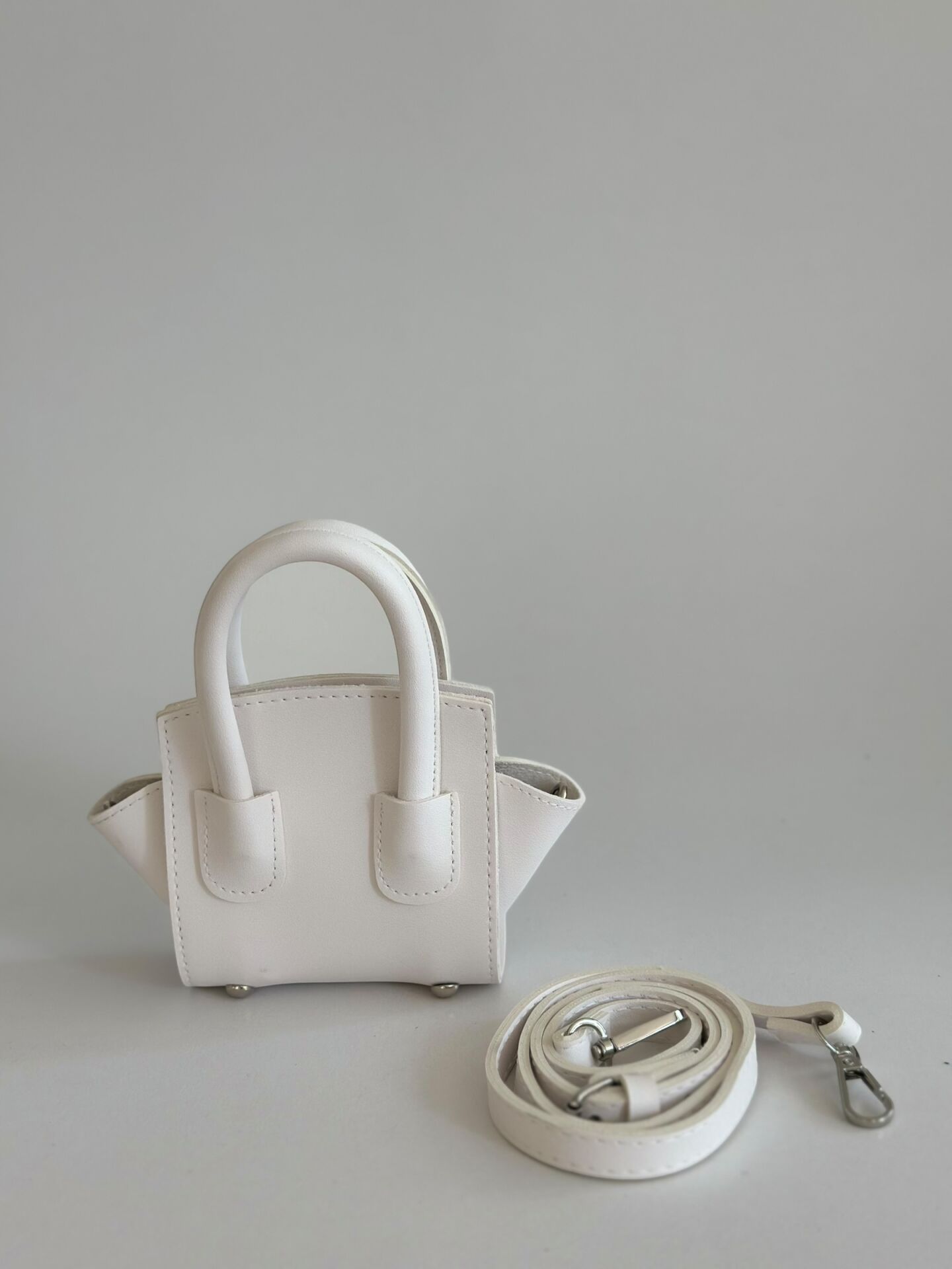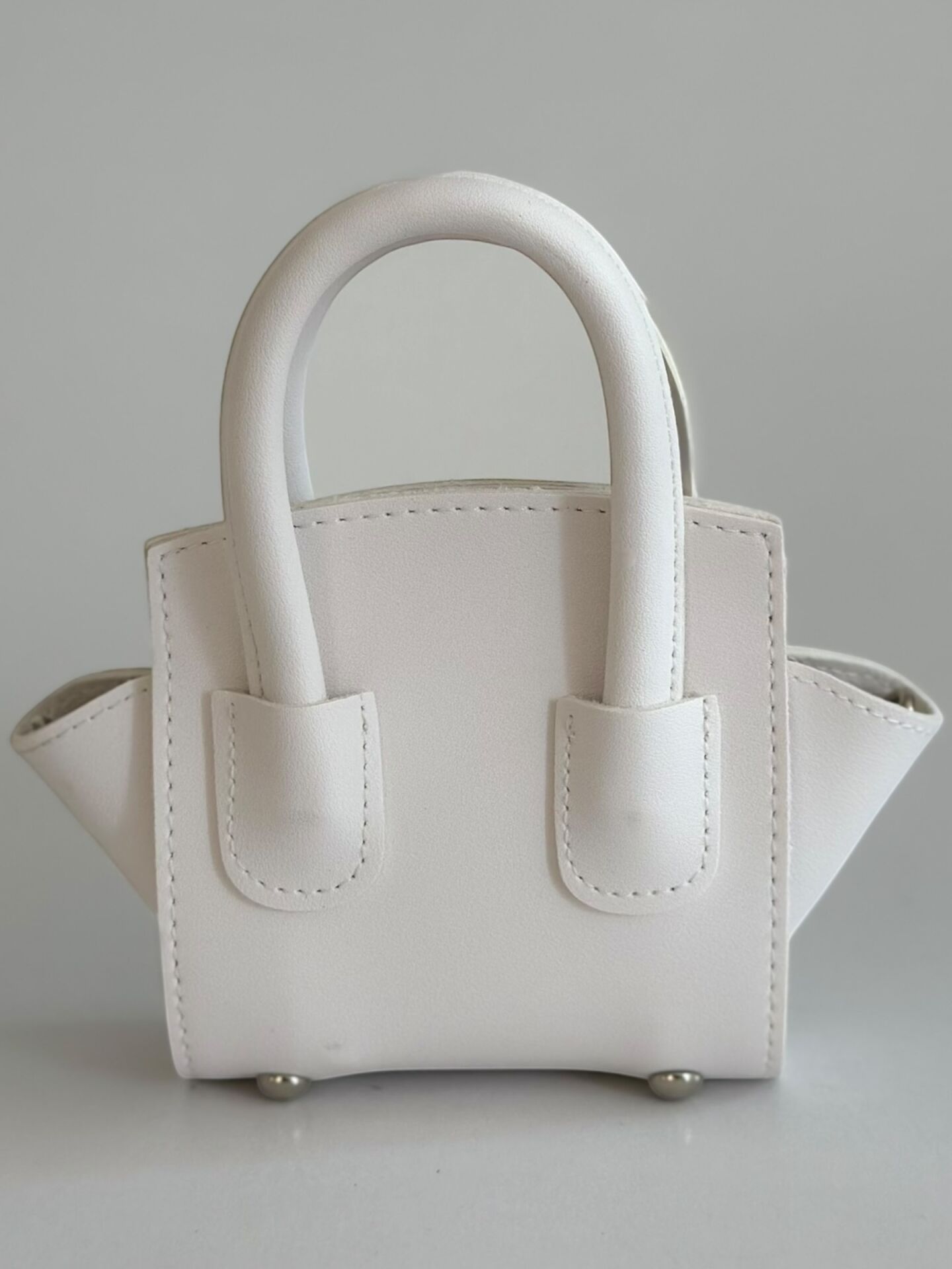 Yaprak formundaki yan detayları ve mikro tote görünümüyle dikkat çeken bu mini çanta, sade ama güçlü bir duruş sunar.