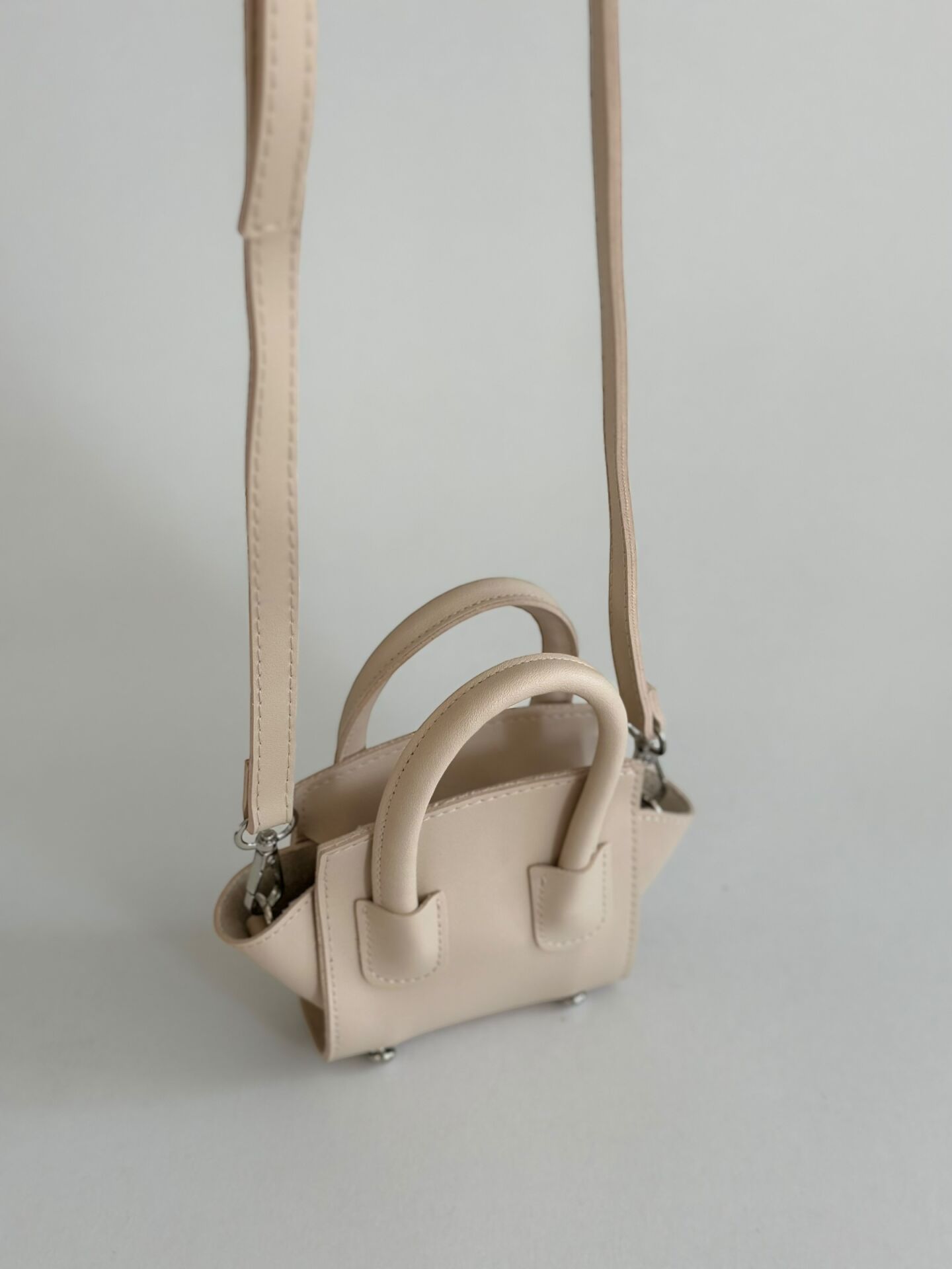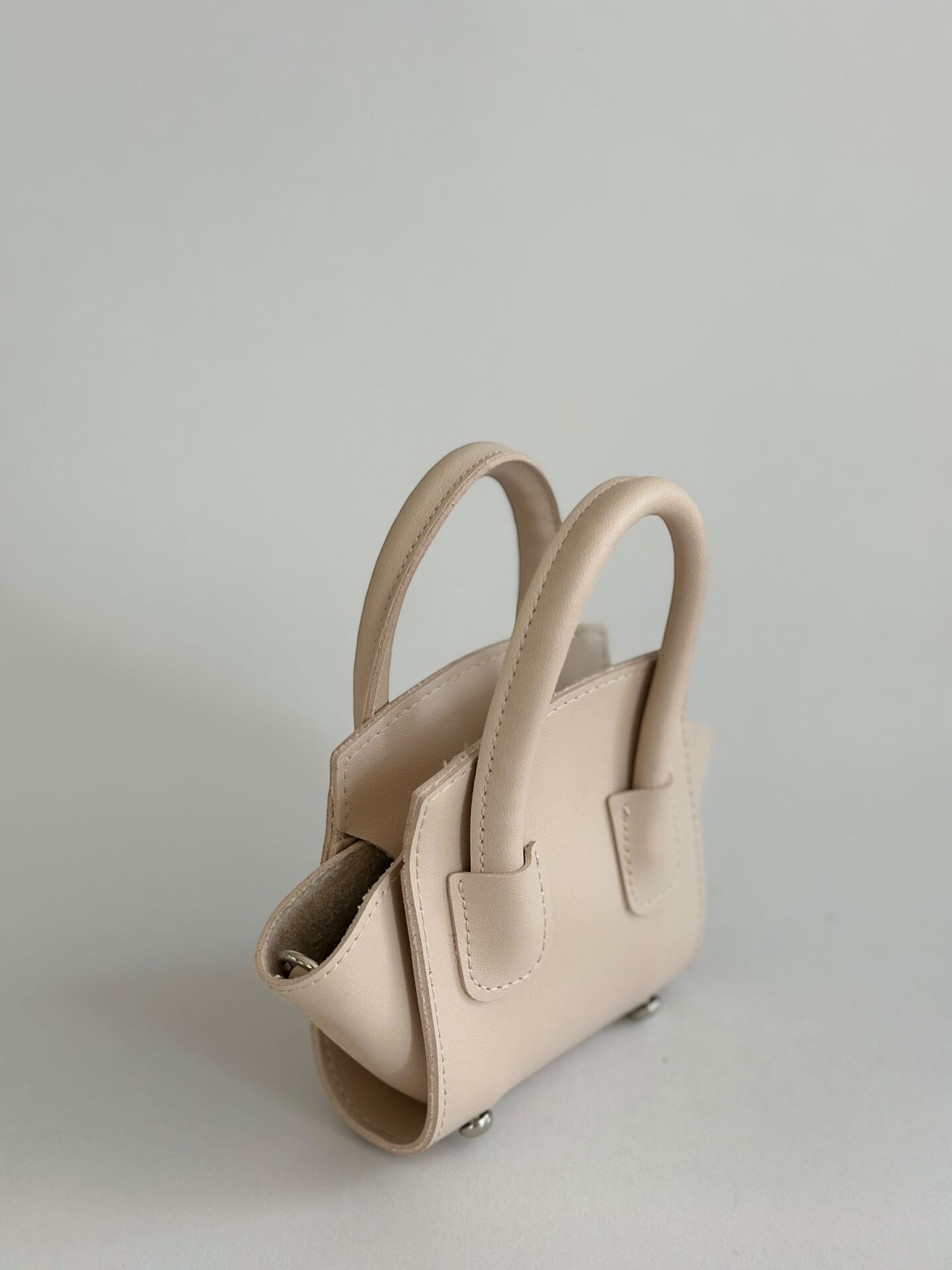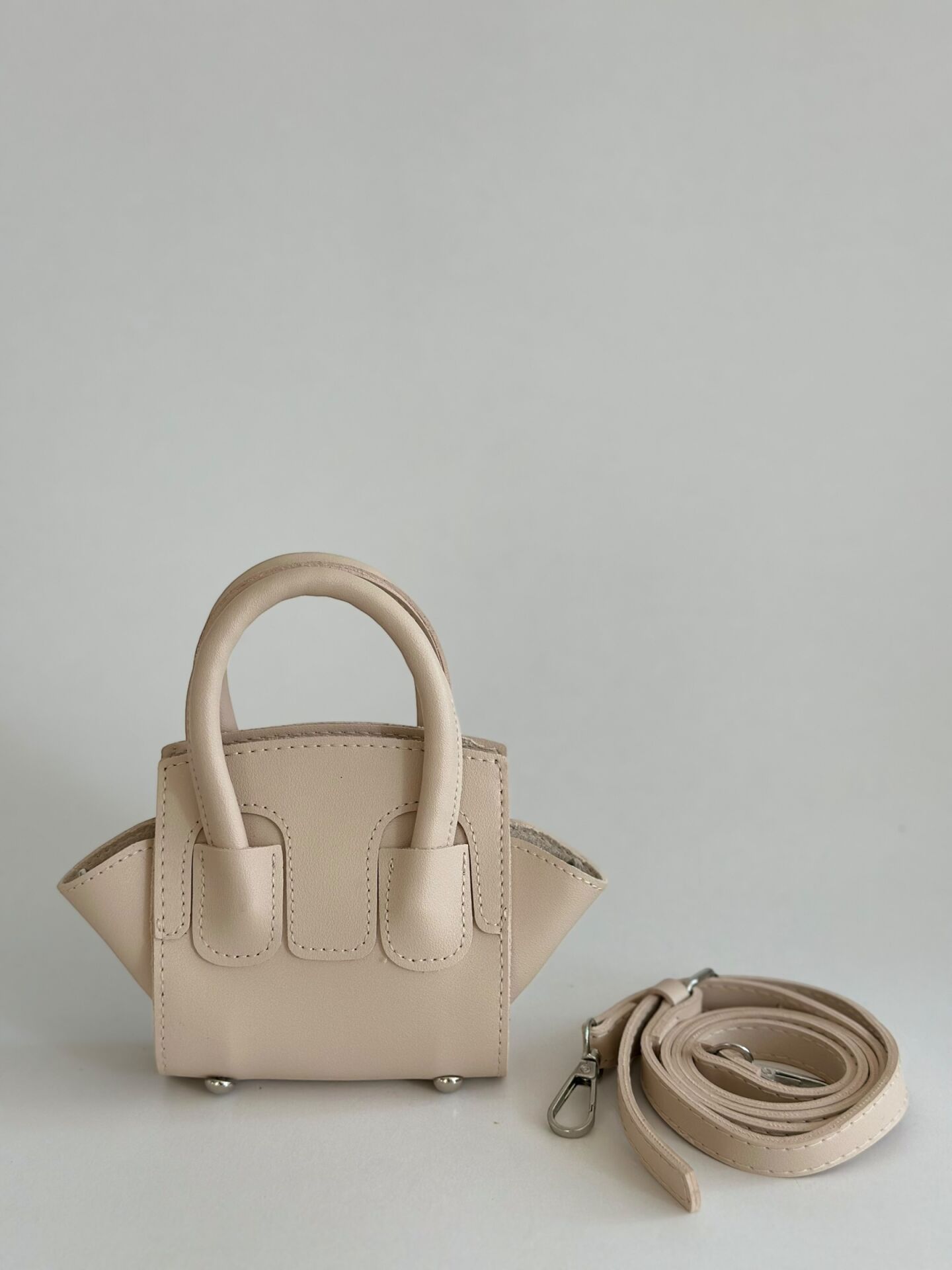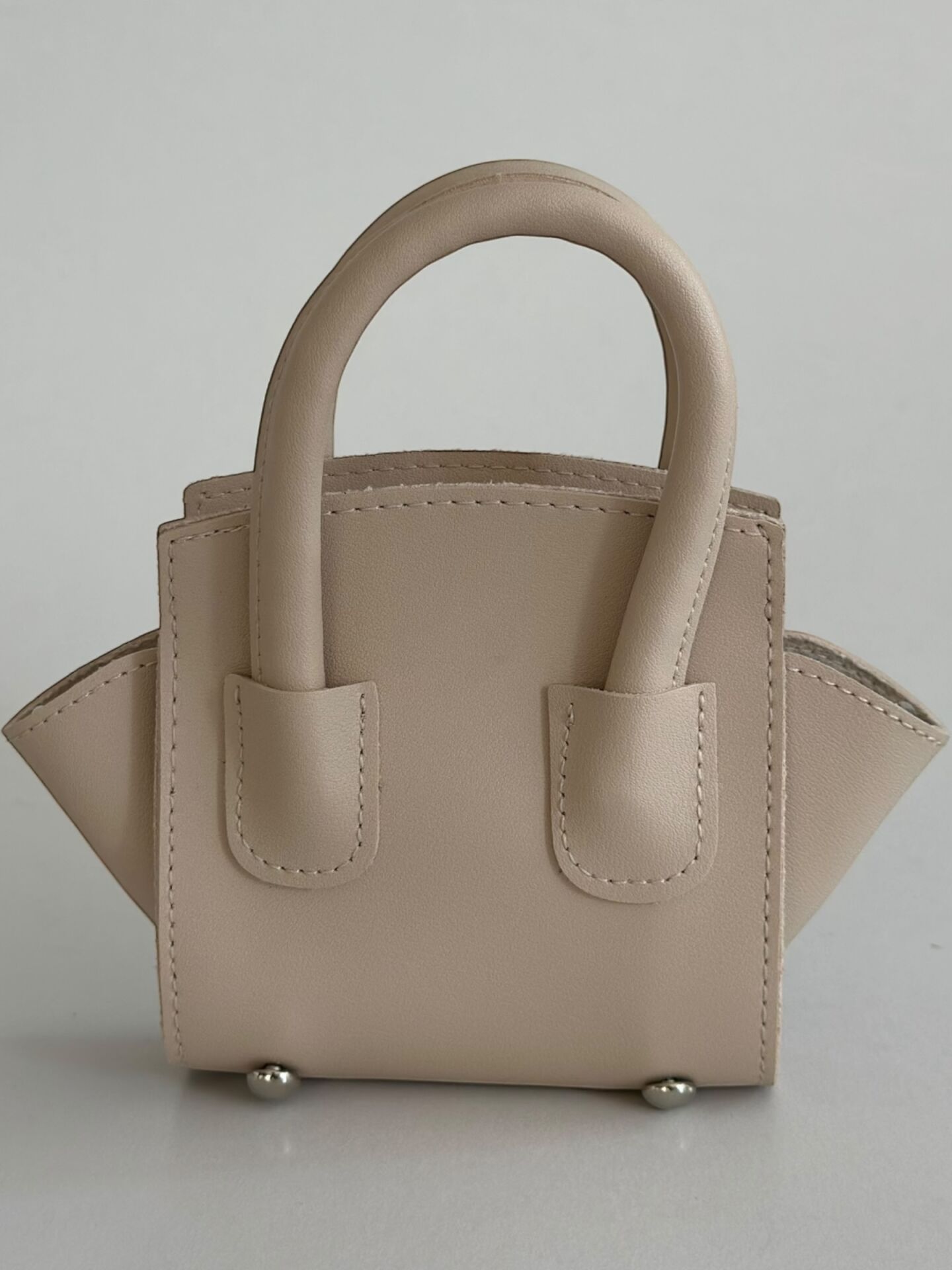 Yaprak formundaki yan detayları ve mikro tote görünümüyle dikkat çeken bu mini çanta, sade ama güçlü bir duruş sunar.